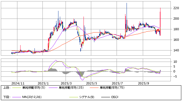アマテイ(5952)の株価は10月14日時点で220円台まで急騰し、前週比で20%を超える上昇となりました。低位小型株らしい軽い値動きが目立ち、短期資金の流入が鮮明です。
