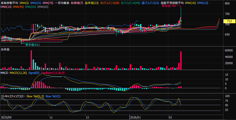 それなのに株価は引けにかけて押し戻され、「急騰不発」に見えるチャートになりました。