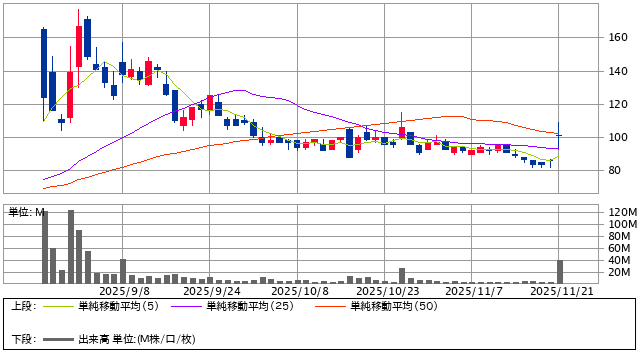 直近では85円を底値とし、株価は反発の動きを見せています。IR発表後には出来高が急増しましたが、日足チャートでは十字線となっており、売りと買いの力がほぼ拮抗している状況です。
