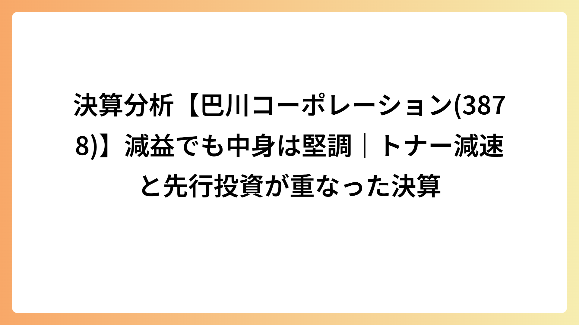 決算分析【巴川コーポレーション(3878)】減益でも中身は堅調|トナー減速と先行投資が重なった決算 2026.02.21 インフラ・エネルギー my-next-goal-is-fire ホワイト企業に転職できたので次はFIREを目指します
