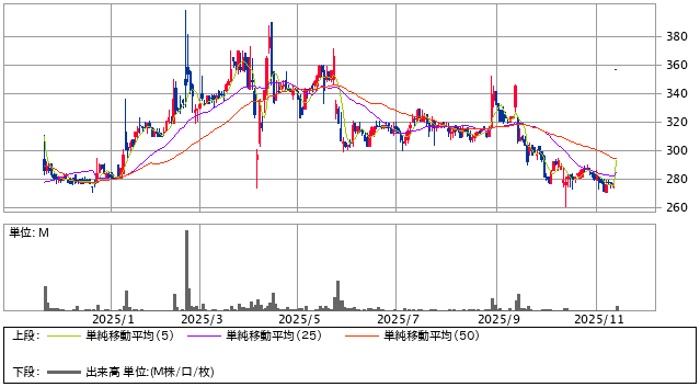 テクニカル面では、今回の急騰で320円のレジスタンスを突破したことにより、短期的には上値の目安となる価格帯に注目できます。利益確定売りや市場全体の動向によって株価が反発する場面もあるため、株価の変動リスクを理解しつつ投資判断することが重要です。