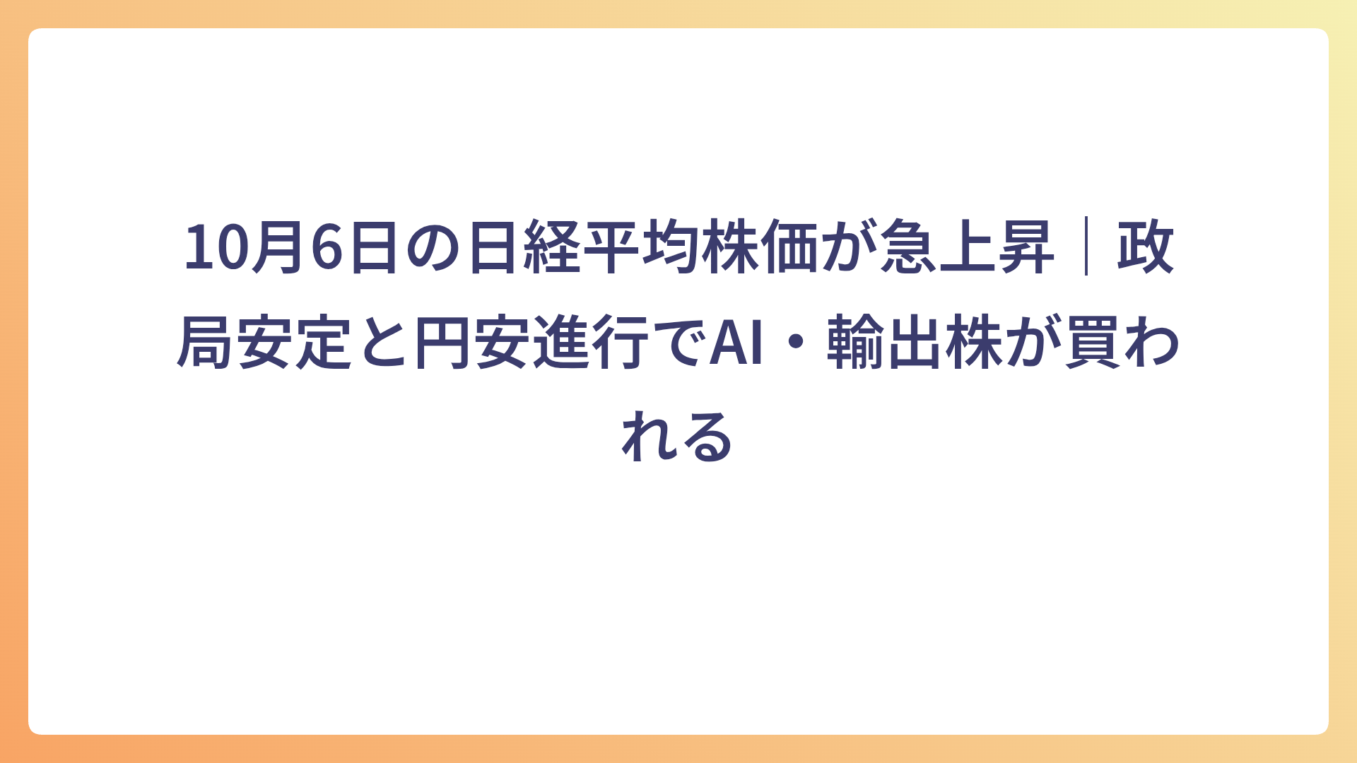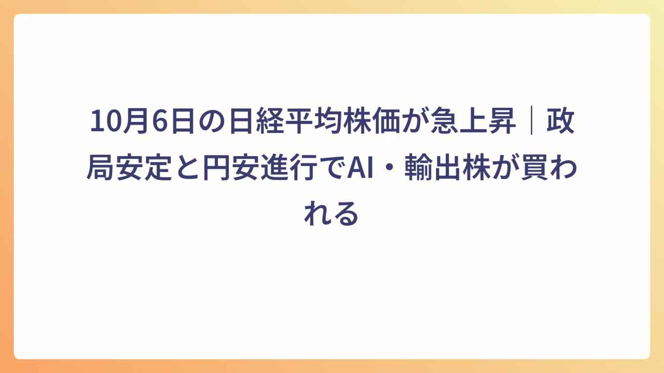 10月6日の日経平均株価が急上昇|政局安定と円安進行でAI・輸出株が買われる 2025.10.06 本日の市場 my-next-goal-is-fire ホワイト企業に転職できたので次はFIREを目指します