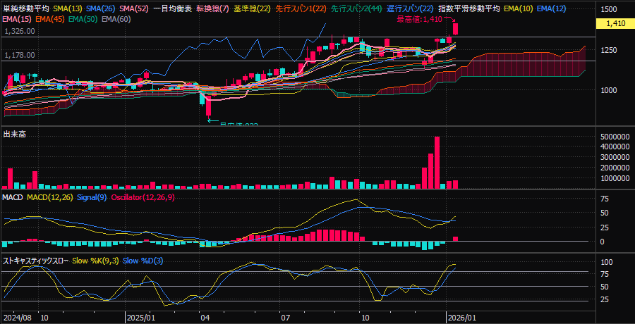 週足ベースで直近高値1326円を突破し、1410円まで上昇しました。