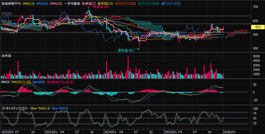 573円突破後は630円が次の焦点となるが、同水準は強い抵抗線であり、利確を意識したい局面といえる。