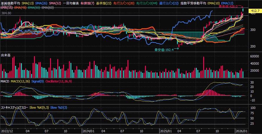 384円が機能しなかった場合でも、週足の基準線は中期トレンドの最終防衛ラインです。