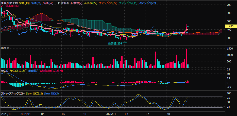 - 一目均衡表:三役好転を確認。週足ベースで上昇圧力が強い状態