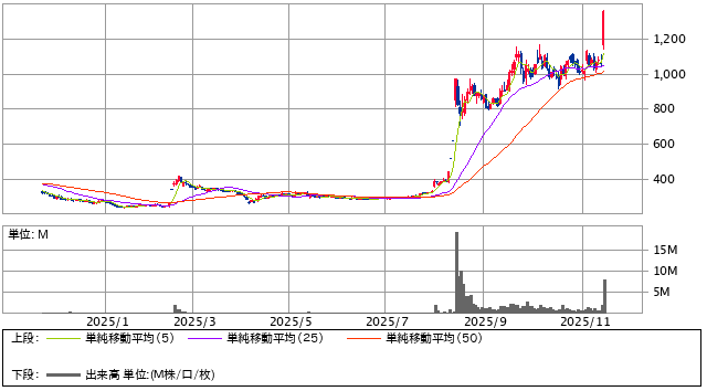 出来高も増加しており、買い圧力の強さが確認されました。今後は、1200円付近が新たなサポートラインとして維持されるかが注目ポイントで、次の目標価格帯として1300円前後が視野に入る状況です。