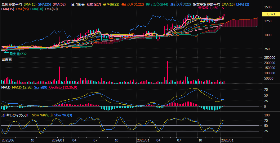 1450円でテクニカル的な天井サインが出ているのに、株価は崩れていません。