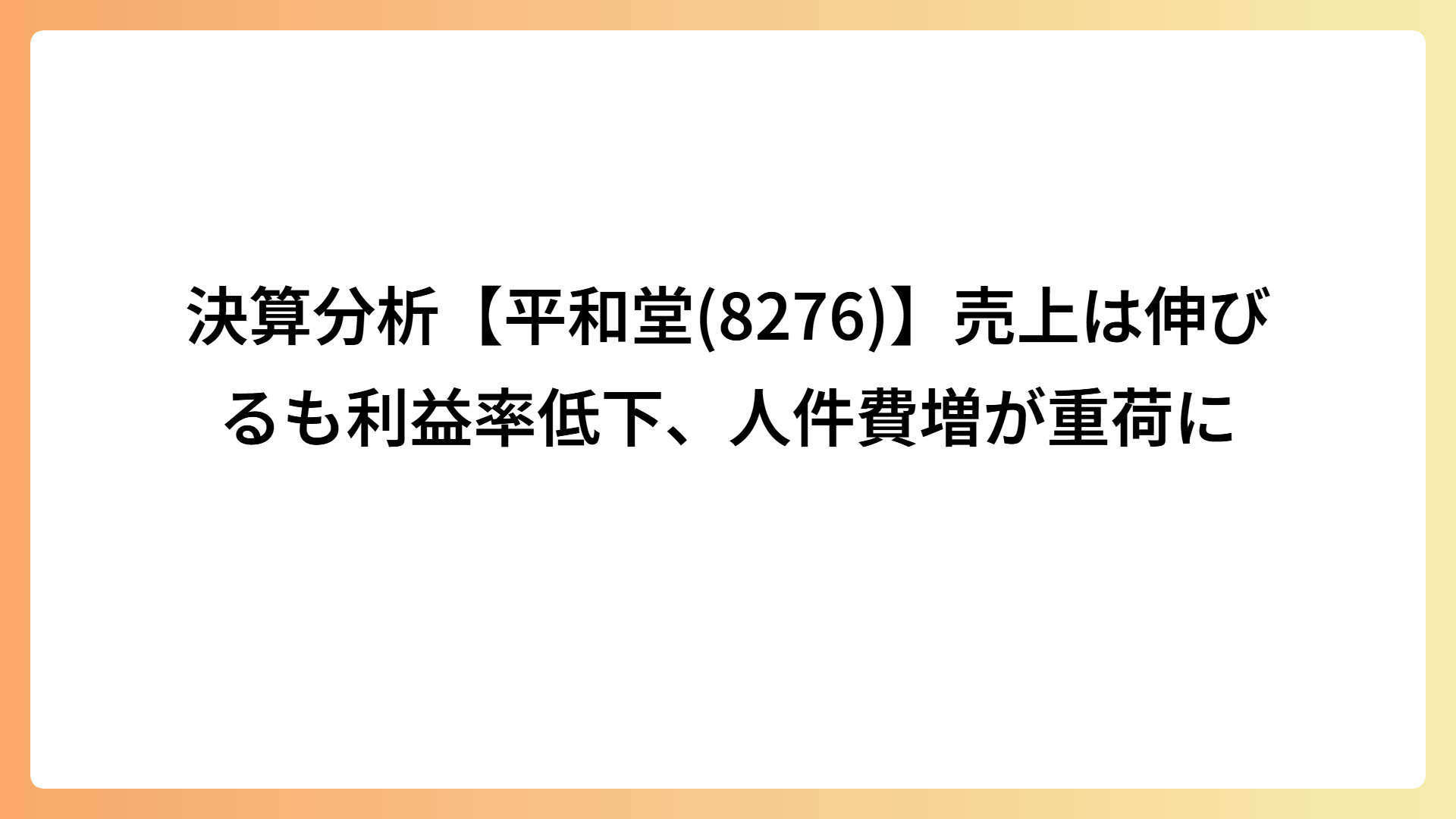 TAG スーパー クスリのアオキHD(3549)は何の会社?食品スーパー型ドラッグストアを解説 2026.04.04 テーマ株 my-next-goal-is-fire ホワイト企業に転職できたので次はFIREを目指します 決算分析【クスリのアオキHD(3549)】M&Aと食品強化で成長継続 2026.04.04 テーマ株 my-next-goal-is-fire ホワイト企業に転職できたので次はFIREを目指します 平和堂はなぜ地域密着で強いのか|滋賀で支持される理由を解説 2026.04.04 テーマ株 my-next-goal-is-fire ホワイト企業に転職できたので次はFIREを目指します 決算分析【平和堂(8276)】売上は伸びるも利益率低下、人件費増が重荷に 2026.04.04 テーマ株 my-next-goal-is-fire ホワイト企業に転職できたので次はFIREを目指します