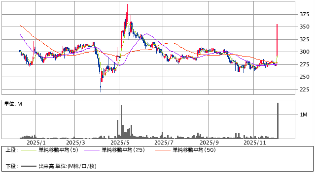 テクニカル面では、急騰で突破した 300円・325円がサポートとして定着するかが上昇トレンド継続の判断基準となります。次の焦点は 375円のレジスタンスライン突破で、ここを越えれば中期的な上値余地が意識される可能性があります。材料と市況がそろえば、再び強い値動きが出る局面も考えられます。